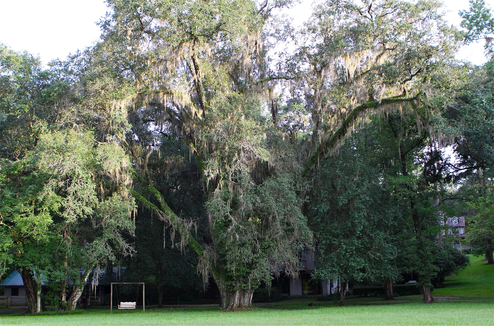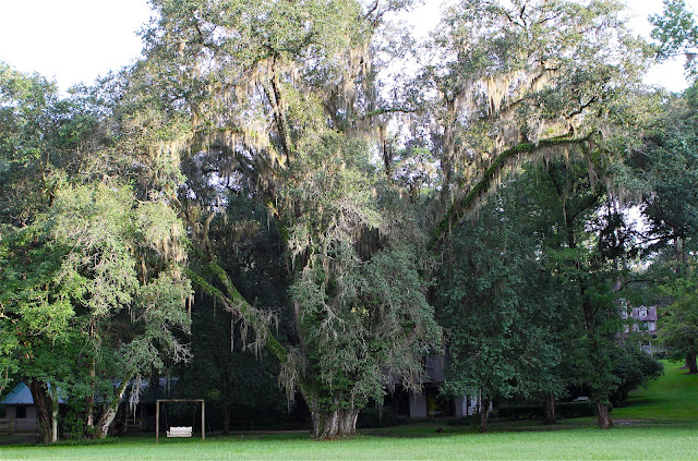 Walking toward the pond there is a huge old oak tree that must be a hundred years old. There are several kinds of plants growing on the trunk of the tree and up the branches.